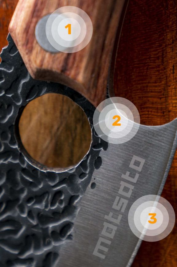 Pisau chef Matsato menampilkan ciri-ciri ketepatan, dimana lubang jari telunjuk diukir menggunakan laser untuk mendapatkan kawalan yang lebih baik semasa penggunaannya. Bilah pisaunya diperbuat daripada keluli tahan karat berkualiti tinggi untuk memastikan ketajaman pisau dan kualiti yang boleh bertahan selama bertahun-tahun akan datang. Pemegang daripada kayu oak premium mungkin merupakan pemegang pisau yang paling selesa dan selamat, yang pernah diciptakan.